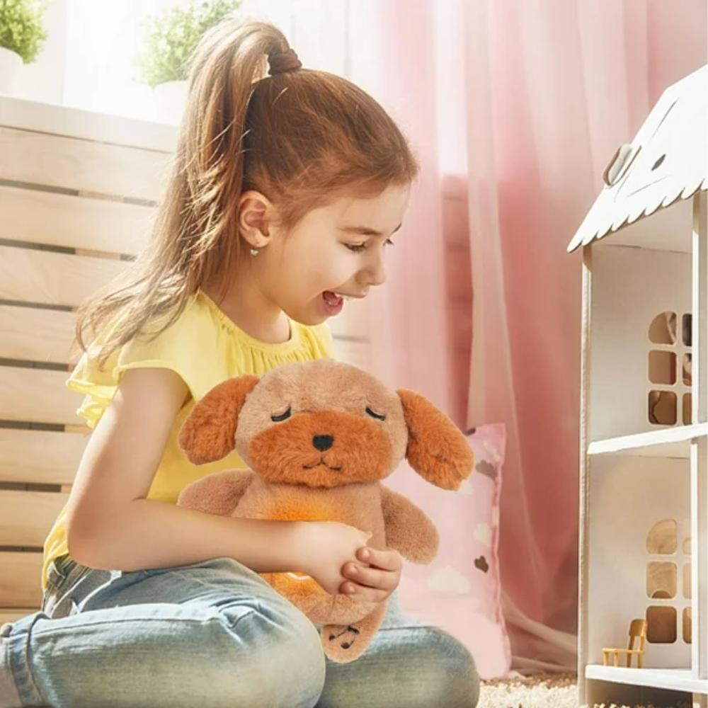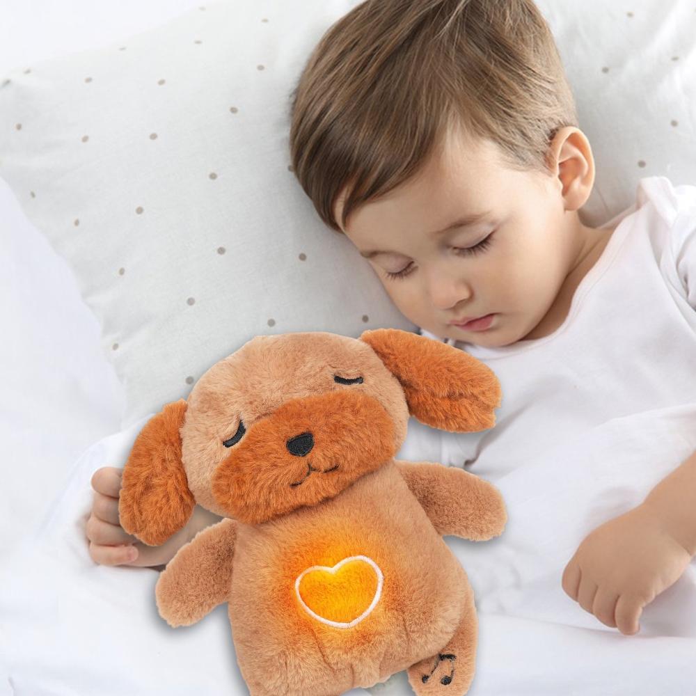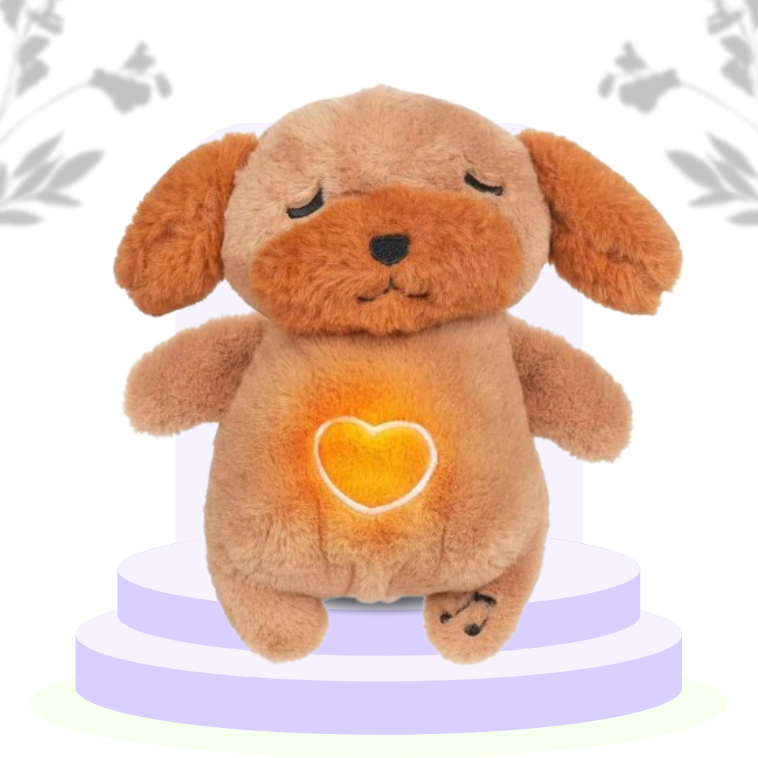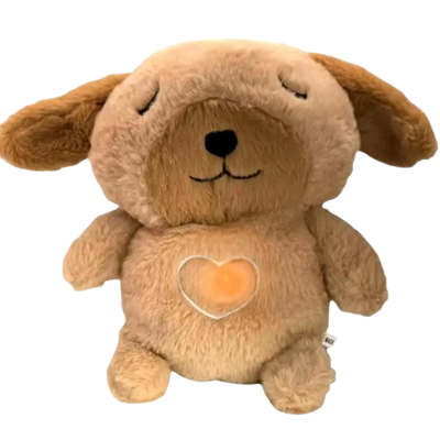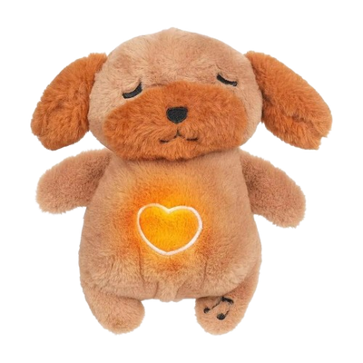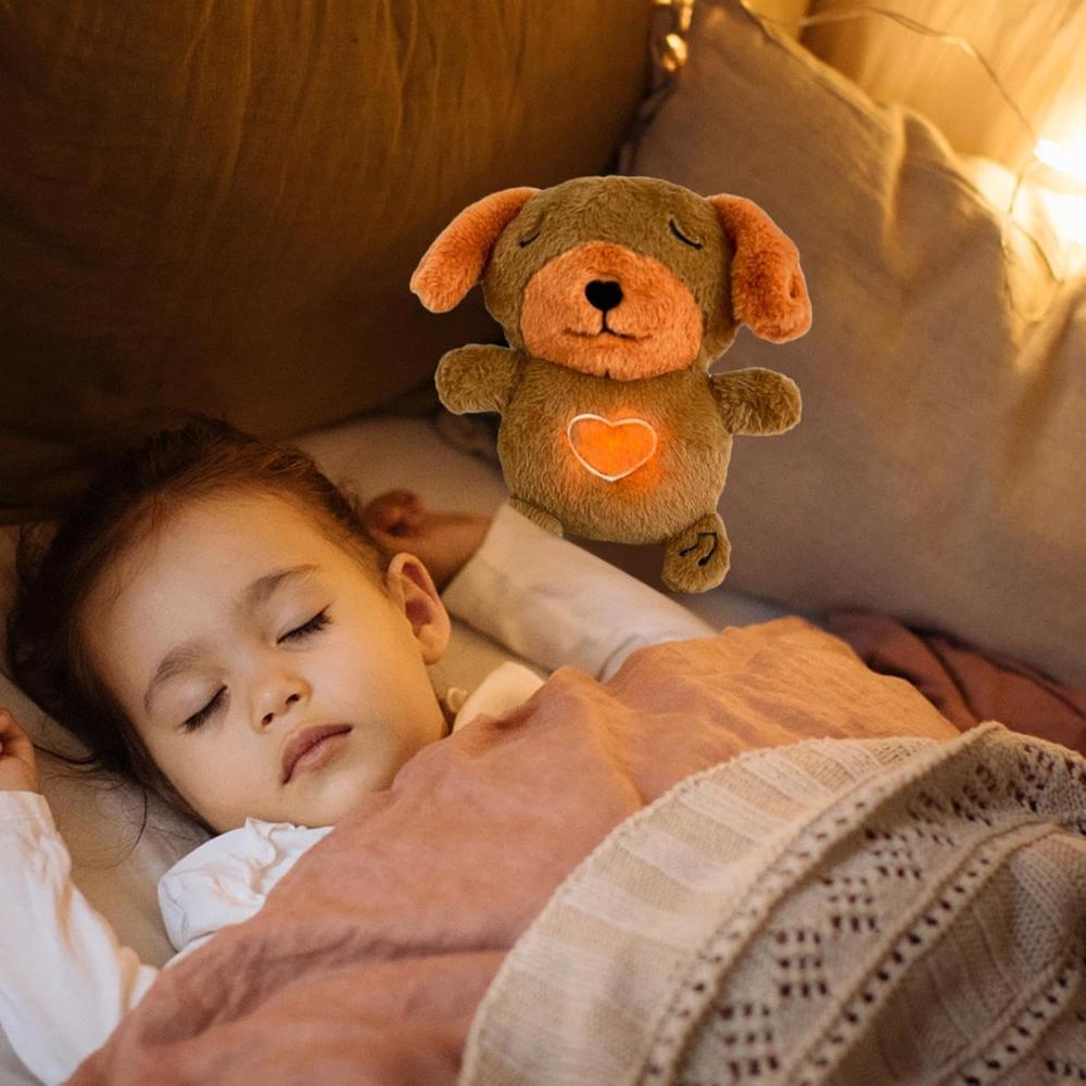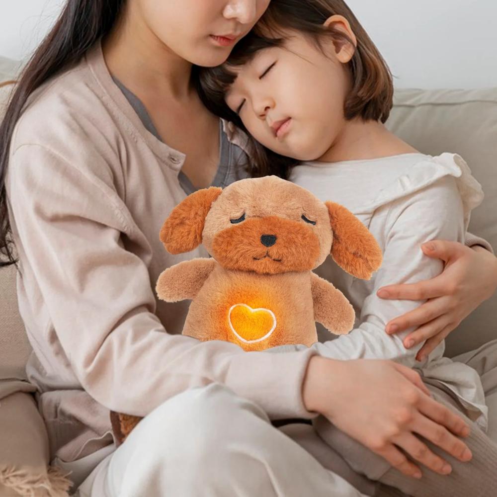 A soothing dog plush with glowing light, calming music, and breathing functions, perfect for creating a peaceful sleep environment for kids and adults.