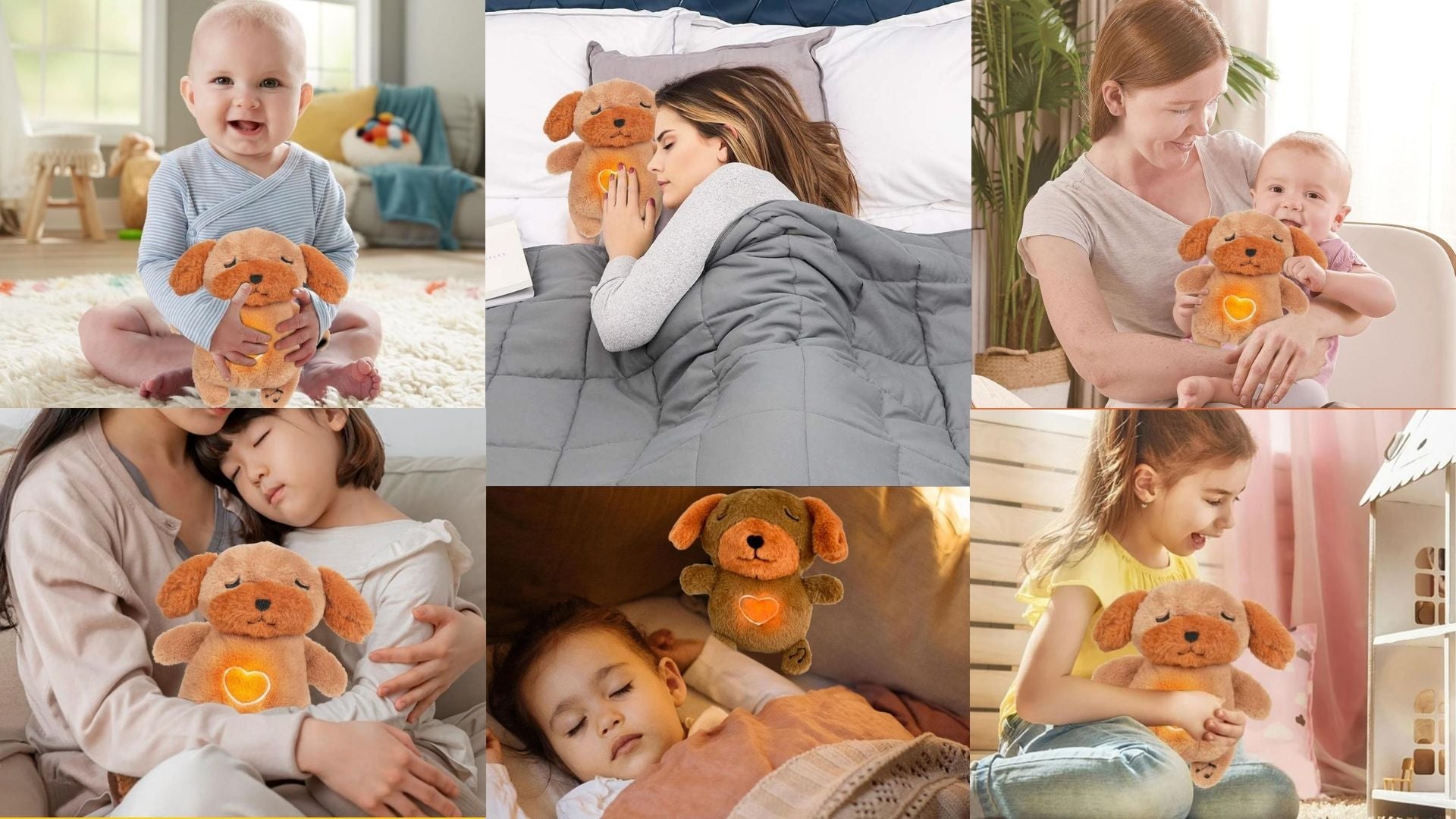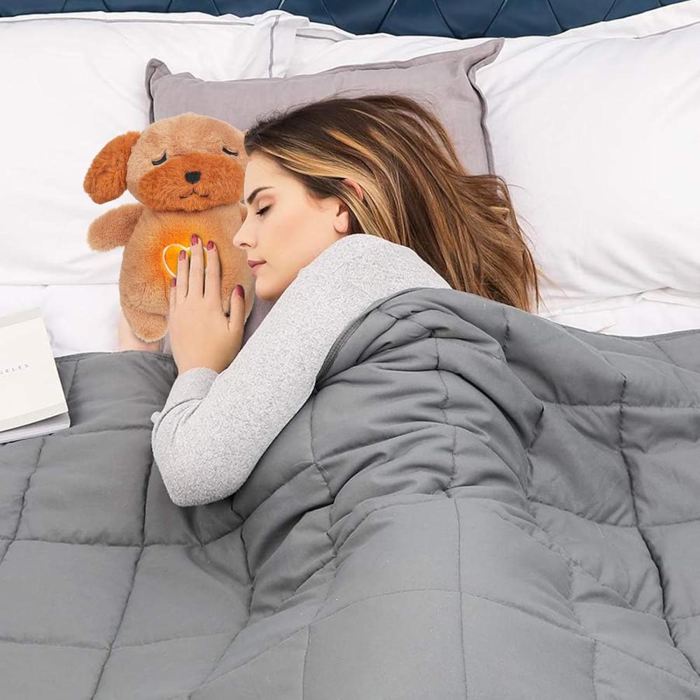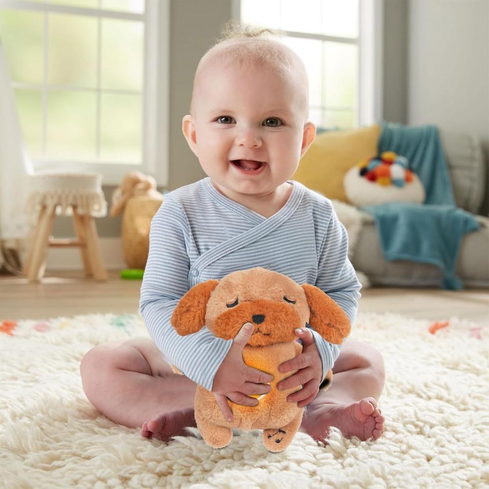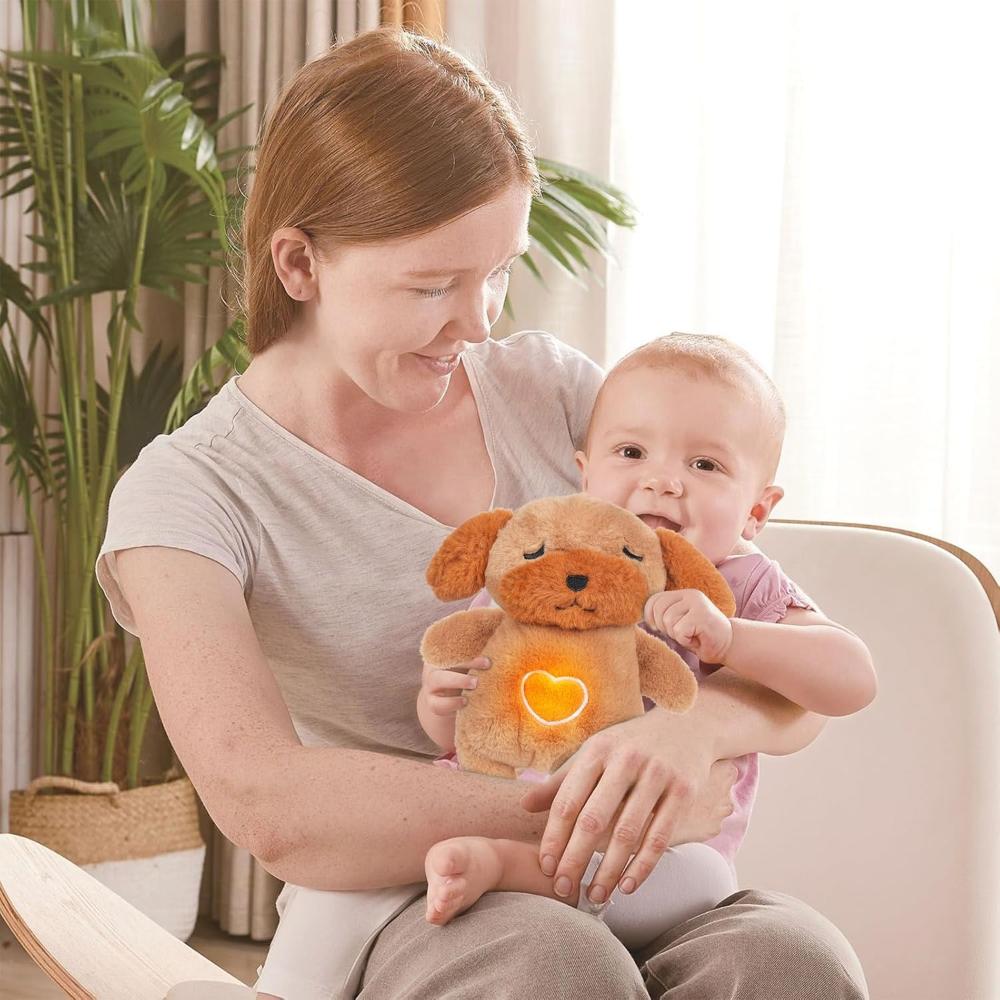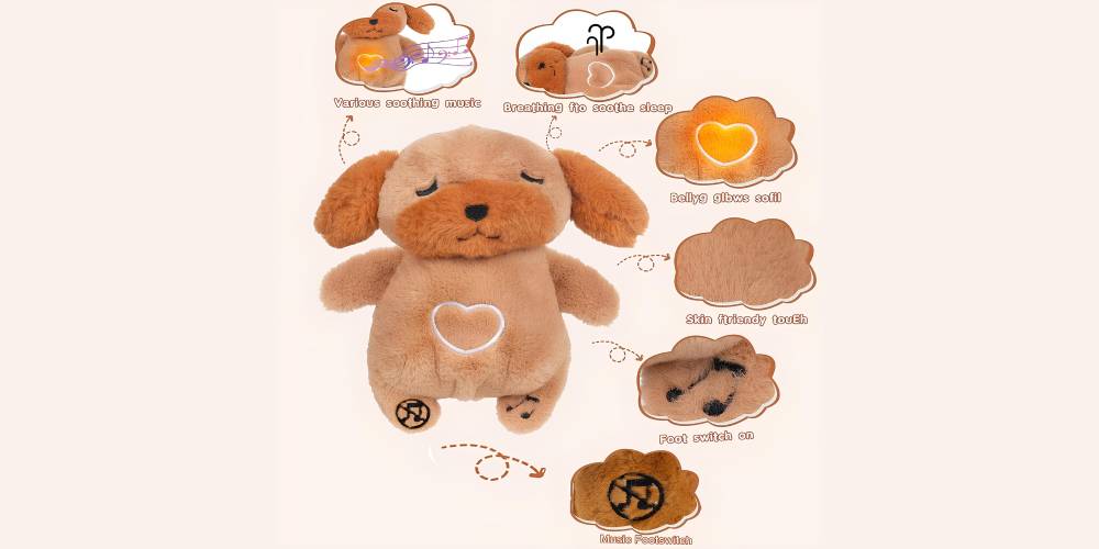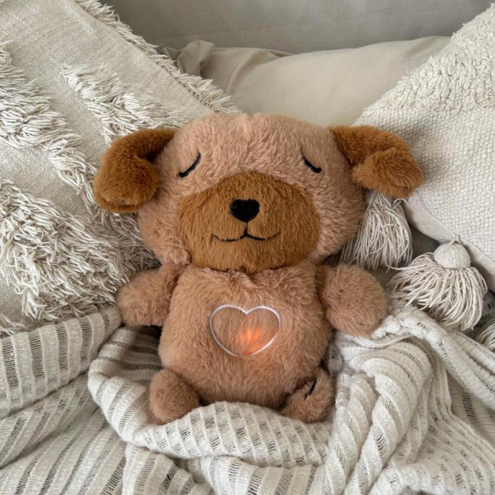 A soothing dog plush with glowing light, calming music, and breathing functions, perfect for creating a peaceful sleep environment for kids and adults.